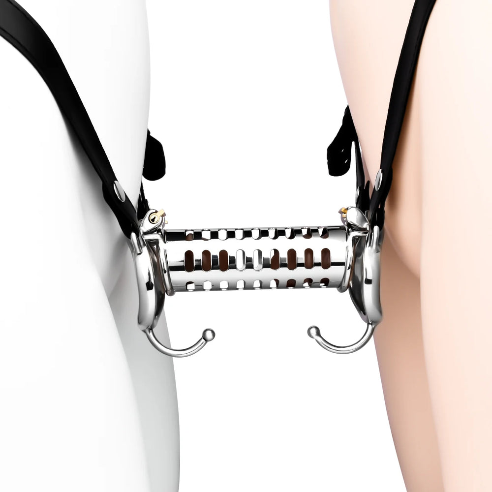 Introducing the Sissy Twin Tease, the ultimate in shared chastity experiences. Crafted from high-quality stainless steel with a smooth polishing finish, this dual chastity cage is designed for those who wish to lock their desires together. Sissy Twin Tease features two cages connected by a central locking bar, allowing for a synchronized experience of restraint. With its sleek, modern design, it's not just about control, but also about the aesthetic of submission. Perfect for couples looking to explore mutual denial or for solo users who enjoy the symbolism of shared captivity. Sissy Twin Tease can be ordered with an adjustable cage belt for a comfortable fit, ensuring that your chastity session is as comfortable as it is binding. Ideal for those who find pleasure in the power dynamics of shared experiences.