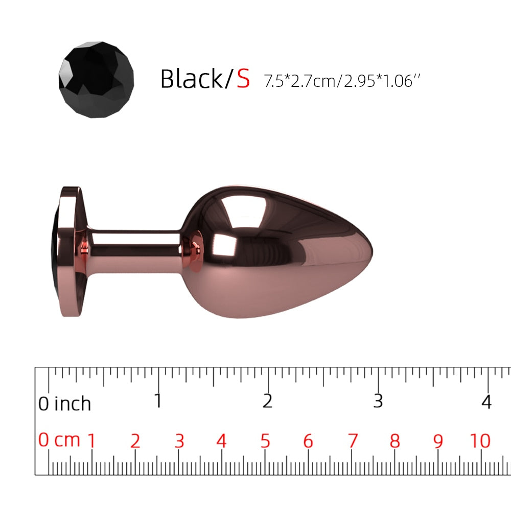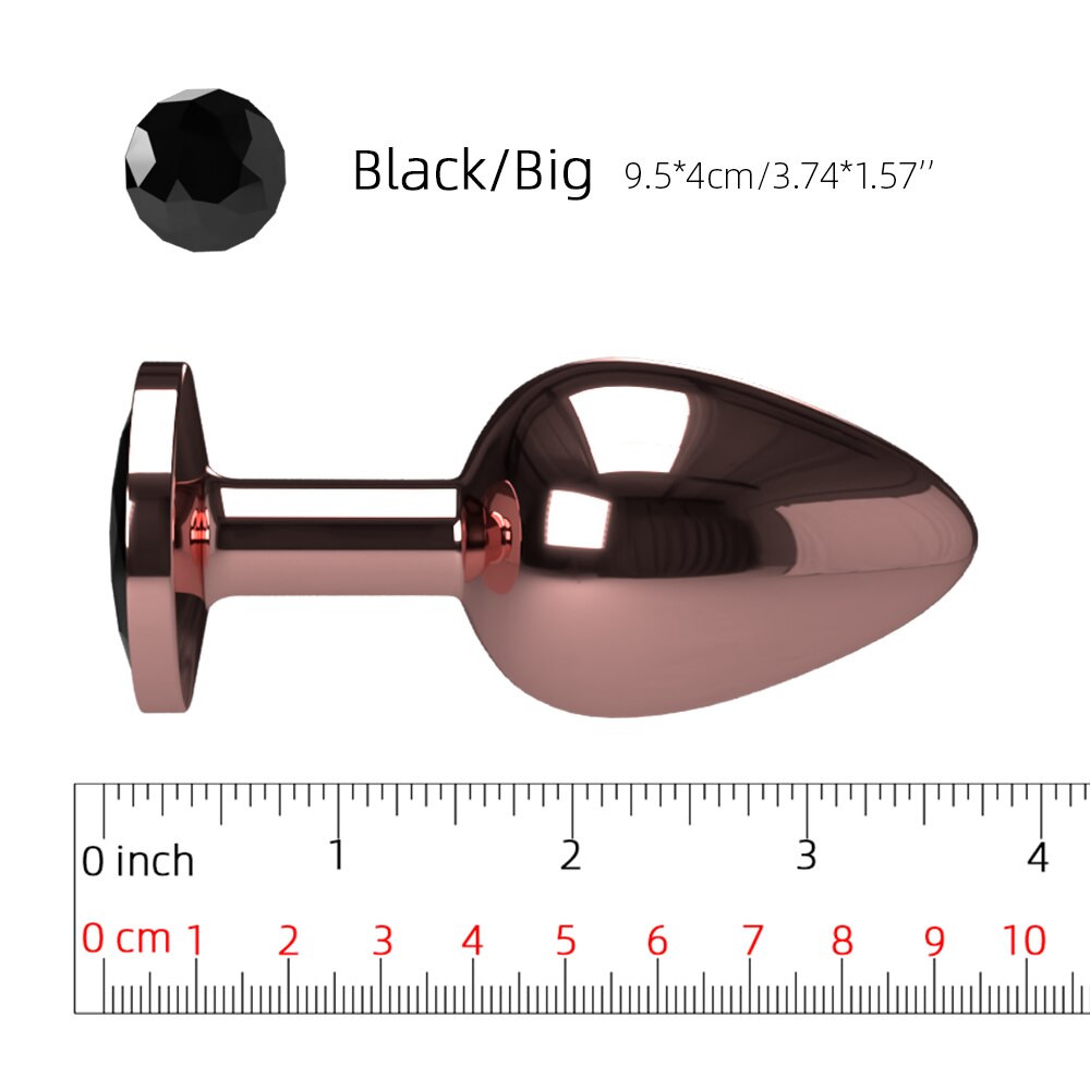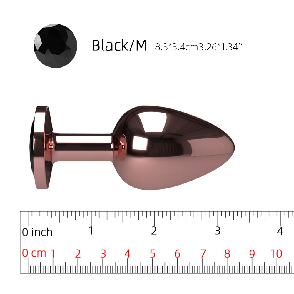 Premium Smooth Metal Rose Gold Crystal Butt Plugs - 3 Sizes - Black-L is backordered and will ship as soon as it is back in stock.