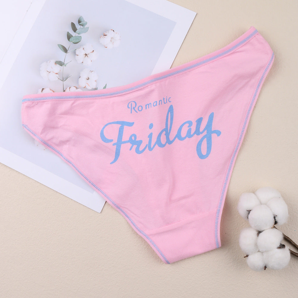 Embrace your feminine charm every day with the "Days of Delight Panty Pack," a 7-pair set of panties, each designated for a day of the week. This collection is designed to make you feel girly, sexy, and organized, with each pair featuring the day's name in a playful, stylish script. Made from a soft blend of 95% cotton and 5% spandex, these panties offer both comfort and a flattering fit, perfect for daily wear.